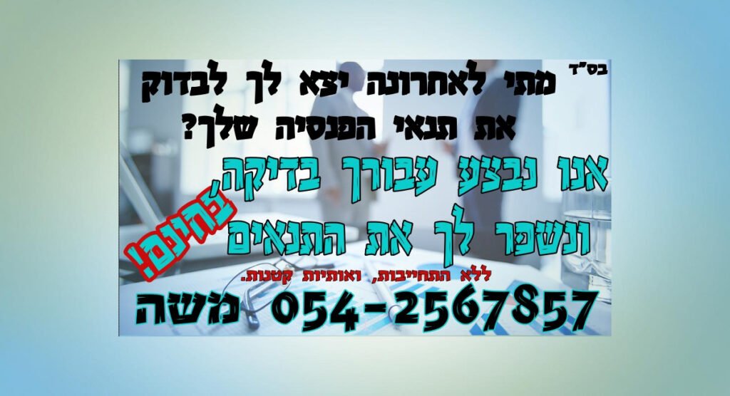 1. בדיקת תכנית הפנסיה הקיימת ושיפורה! 2. מתן דיאגנוזה של מה יש לכם\ ומה אתם עתידים לקבל במעבר 3. אפשרות מיוחדת לציבור הדתי \ מסורתי למעבר לתוכנית כשרה * שקיפות מלאה ללא אותיות קטנות. על מנת לקבל את השירות מה אתם מתבקשים לפעול? א. לשלוח בדוא”ל \ וואצאפ את שמכם ב. לשלוח את מספר